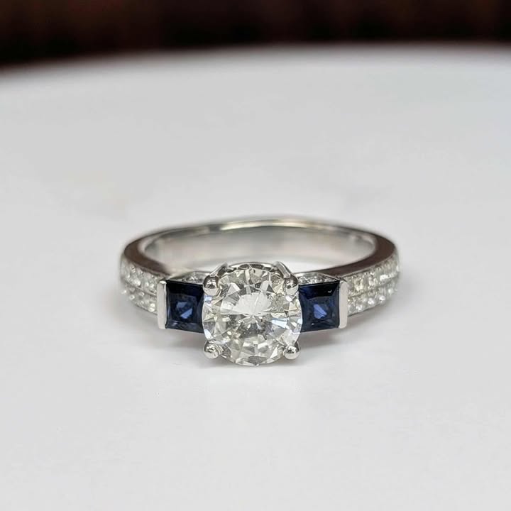 Total Carat Weight: 1.49 CT.T.W. Main Stone: Round-cut Diamond (1.14 CT) Side Stones: Diamonds (0.35CT.T.W) & Blue Sapphires Metal: 14k White Gold Style: Three Stone | Gemstone Bridal | Double Band | Peek-a-book Diamond