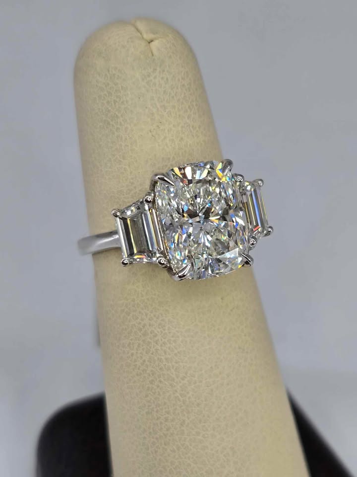 Total Carat Weight: 7.61 CT.T.W.Center Stone: 5.03ct Custion-cut Lab Created Diamond (VS1, D)Side Stones: 1.58 CT.T.W. Trapezoid-Cut Lab Created DiamondMetal: 14k White GoldStyle: Three Stone