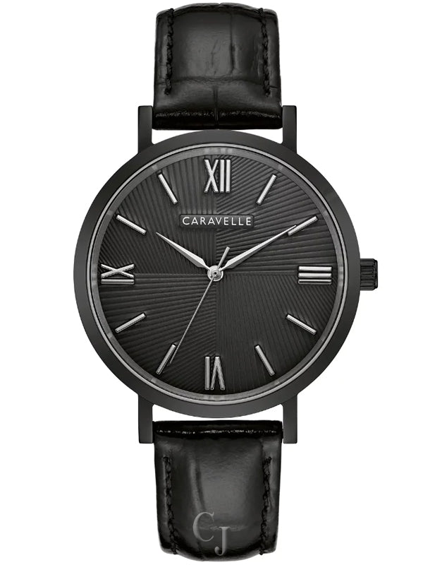 The Classic Caravelle by Bulova Men’s watch showcases a Black IP case adorned with a patterned dial, complemented by Roman and stick indexes. It is equipped with a mineral crystal, secured elegantly on a black leather strap with a buckle closure. Additionally, this timepiece boasts water resistance up to 30 meters.