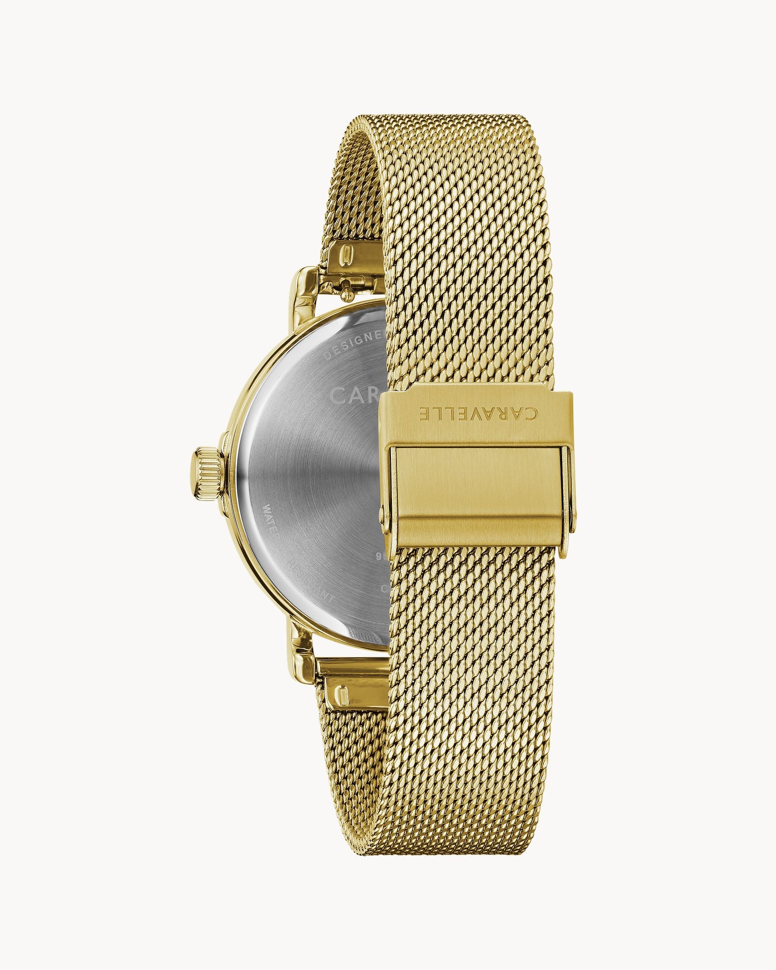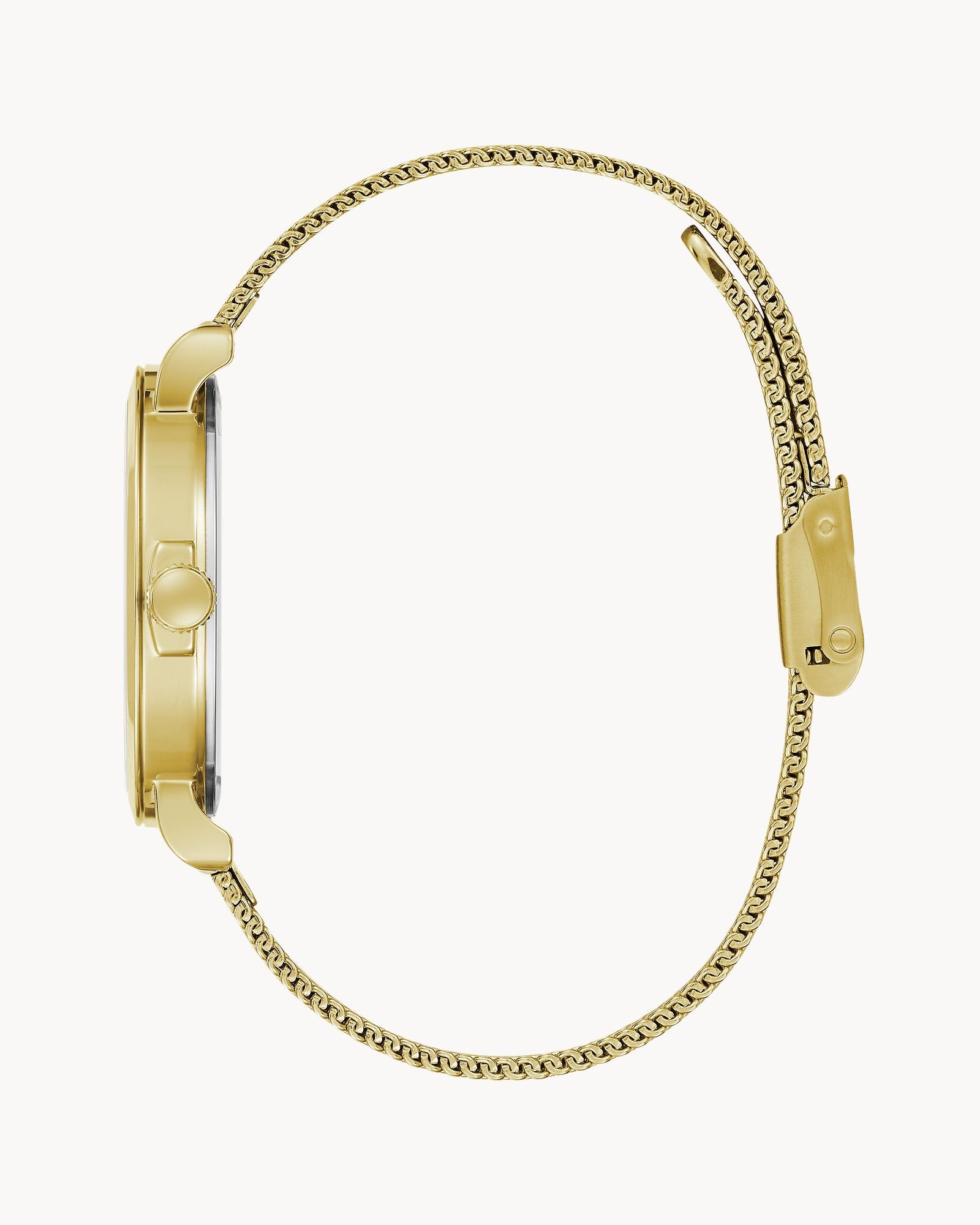 Refined design highlighting the precision of time keeping. Gold-tone stainless steel case and comfortable, easy to adjust mesh bracelet with sliding clasp closure. Minimalist black dial featuring eight crystals on the dial and gold-tone hands.