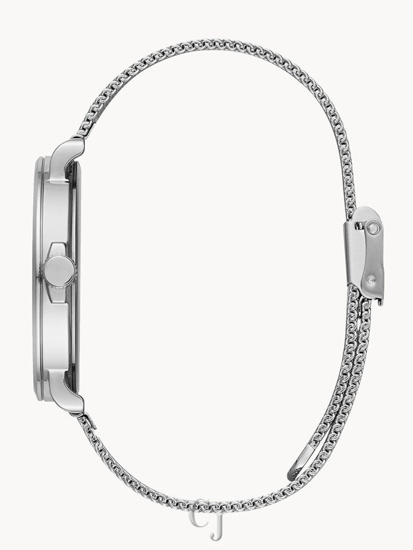 Go for maximum impact with minimalist design. Dark blue sunray dial accented with silver-tone hands and hour markers. Stainless steel case and mesh bracelet with sliding clasp closure and quick-release spring bar.