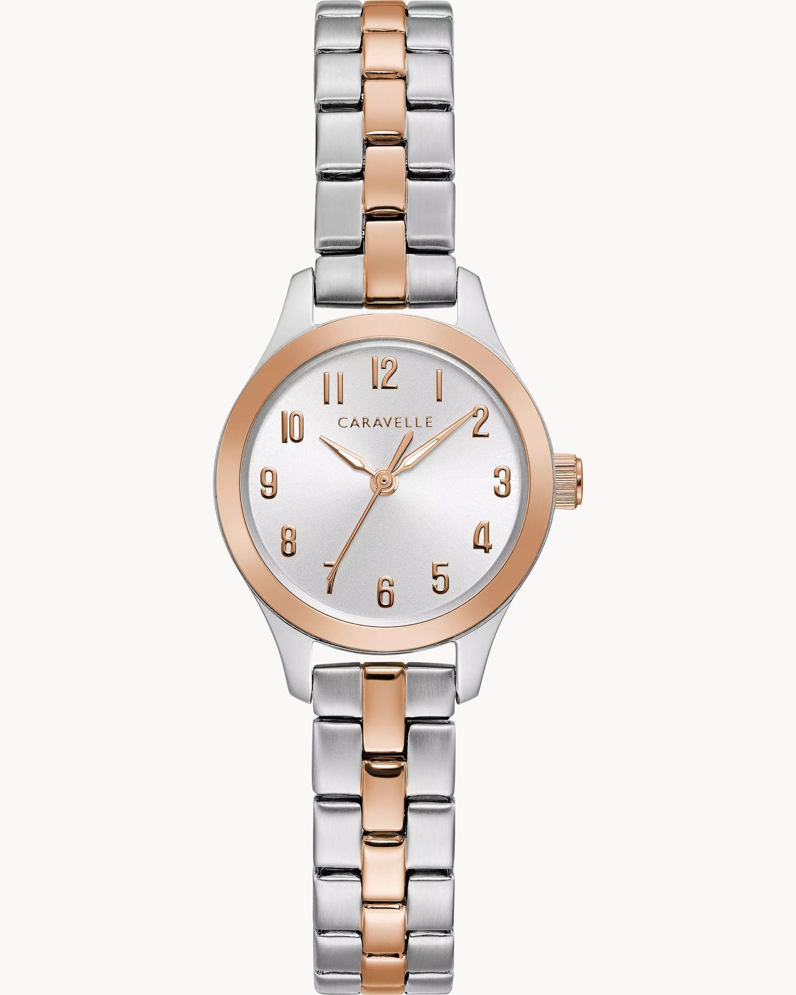 Less is more with this gracefully proportioned rose gold-tone accented stainless steel case with easy-to-read numerals on silver-white sunray dial. Alternating polished and brushed three-link stainless steel bracelet with rose gold-tone accents and jewelers clasp closure.
