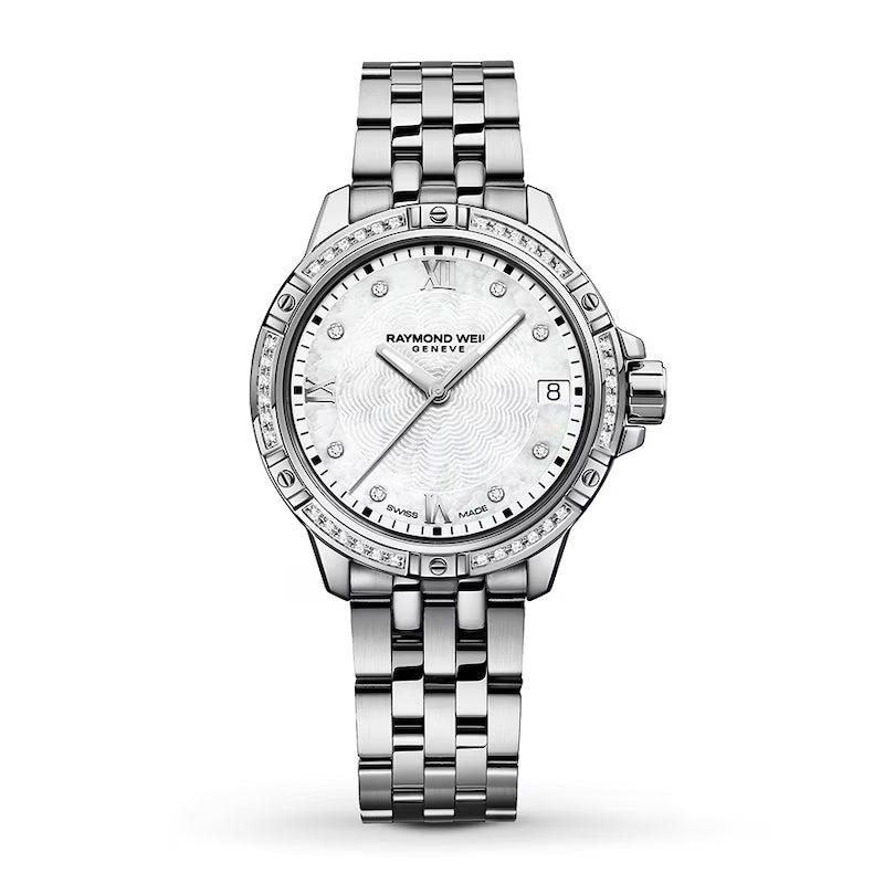 This Tango women's watch from RAYMOND WEIL brings together a 30mm stainless steel case, diamond bezel, and a stainless steel bracelet with a lustrous white mother-of-pearl dial showcasing sparkling diamond hour markers and a date window. The watch features Swiss quartz movement, a scratch-resistant sapphire crystal, and water-resistance to 100 meters. The bracelet secures with a push-button fold-over deployment clasp with a safety.